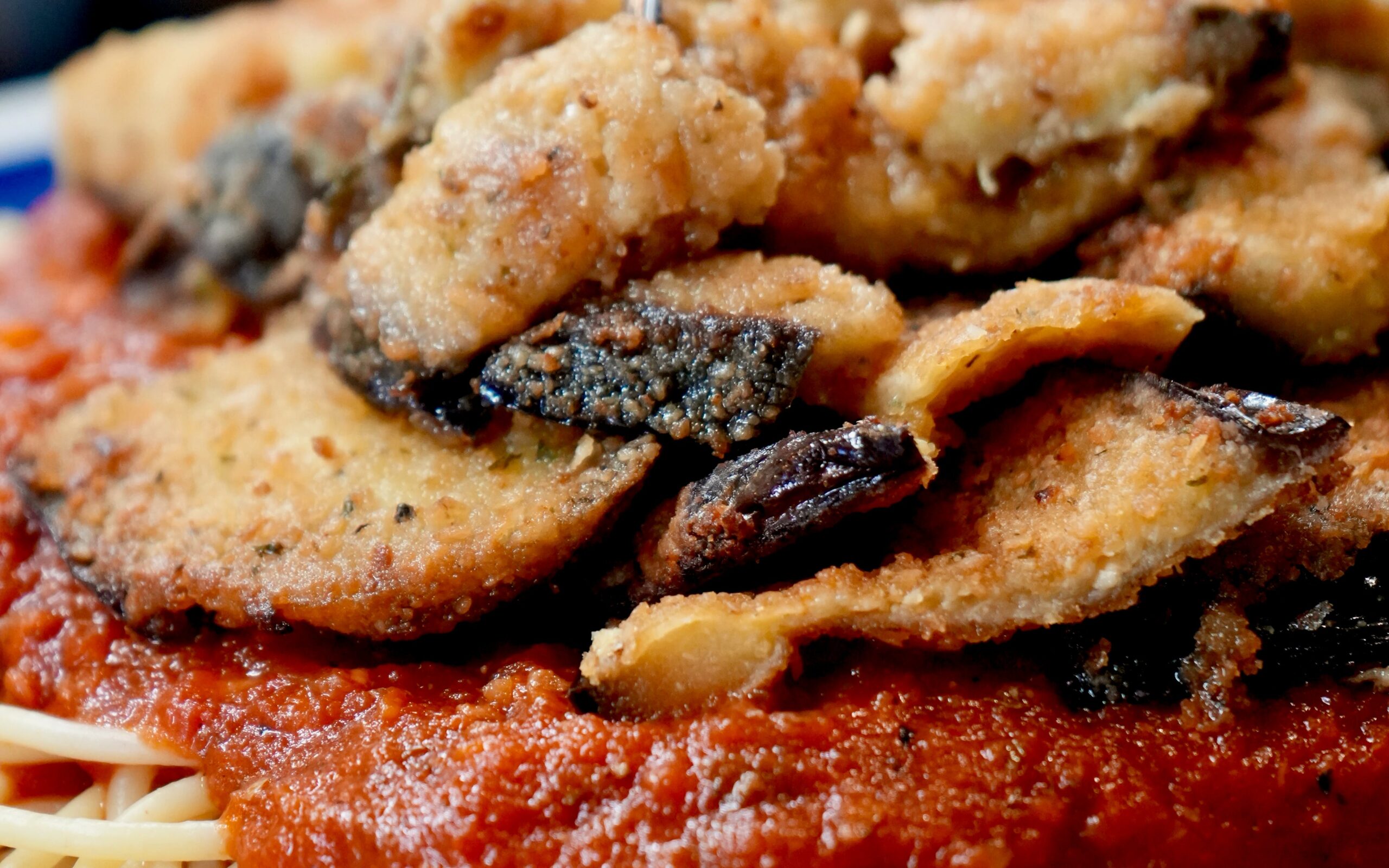 Lightly breaded sliced of eggplant served on a bed of spaghetti with hearty tomato sauce.