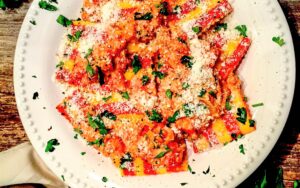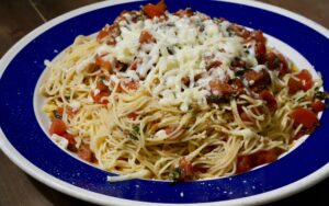 Angel hair pasta tossed with our hearty marinara sauce, roasted zucchini, eggplant, onions, garlic, mushrooms and melted cheese.